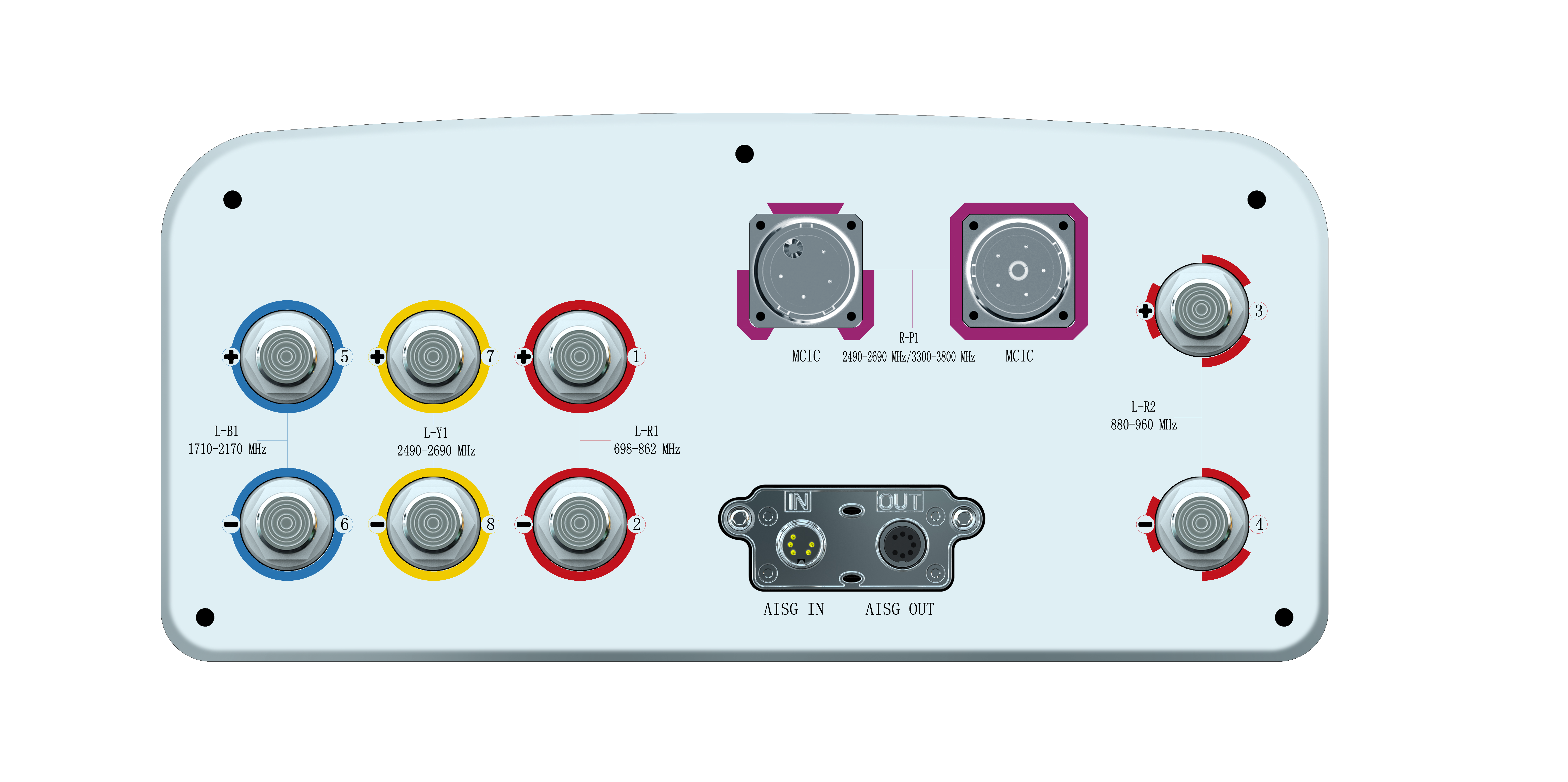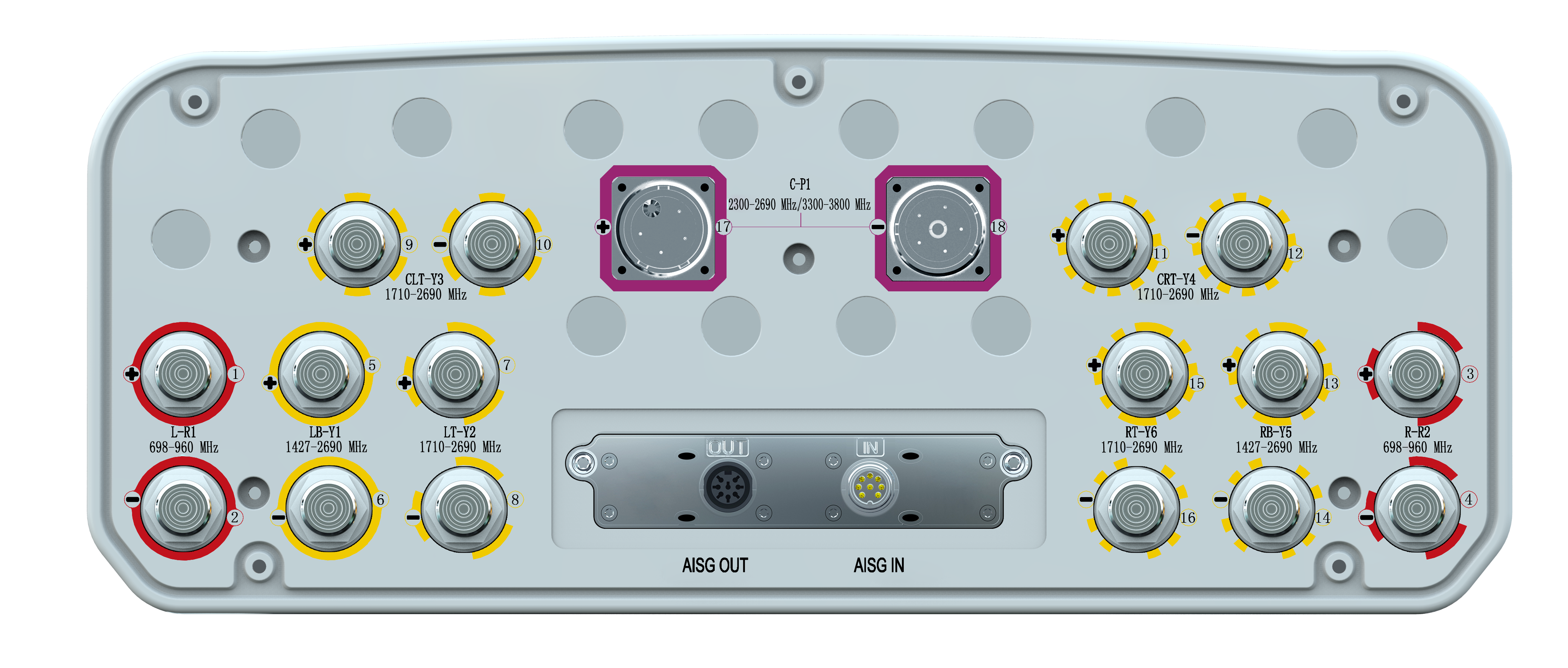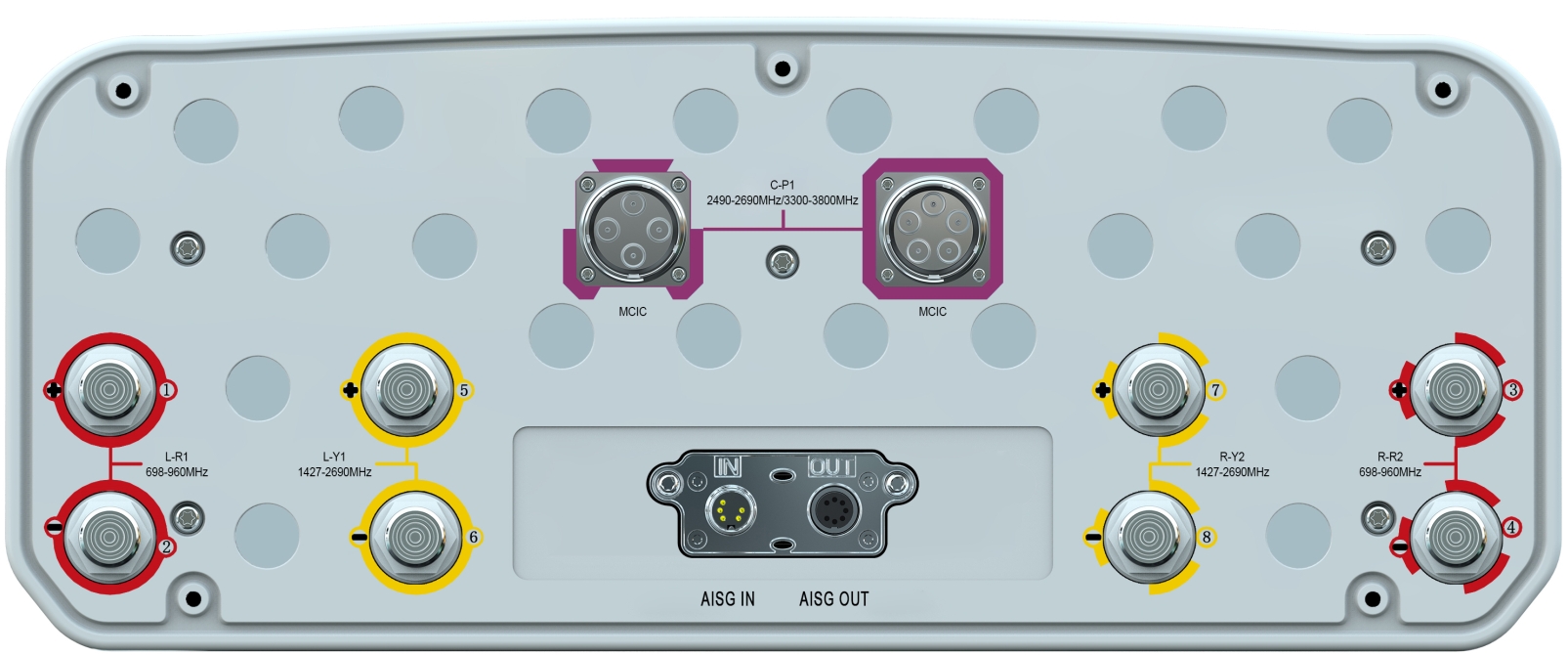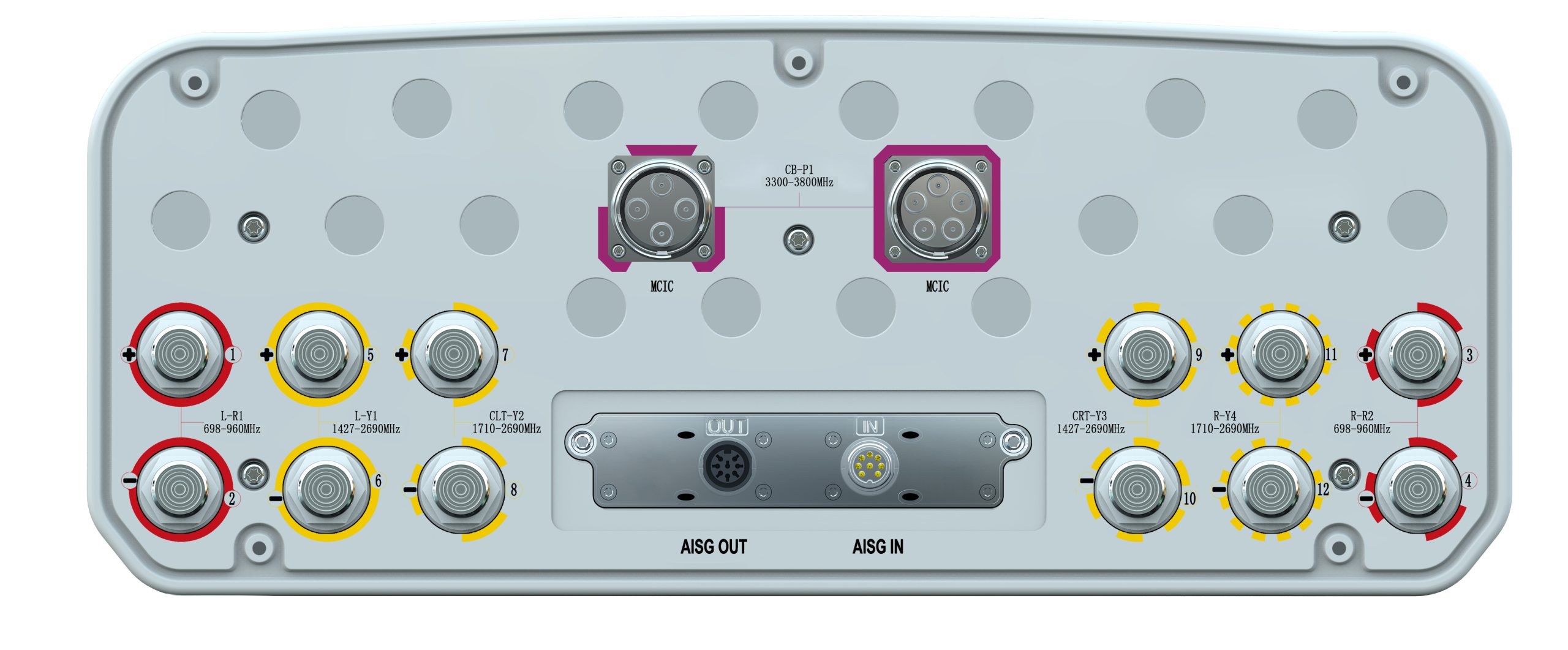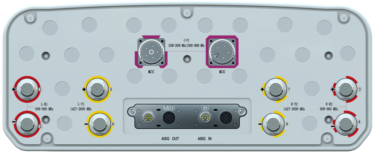 20-Port Beamforming Antenna, 2×698-960MHz and 2×1710-2690MHz and 2×1427-2690MHz 65° HPBW, and 3300-3800MHz Beamforming 8T8R, 7×RET