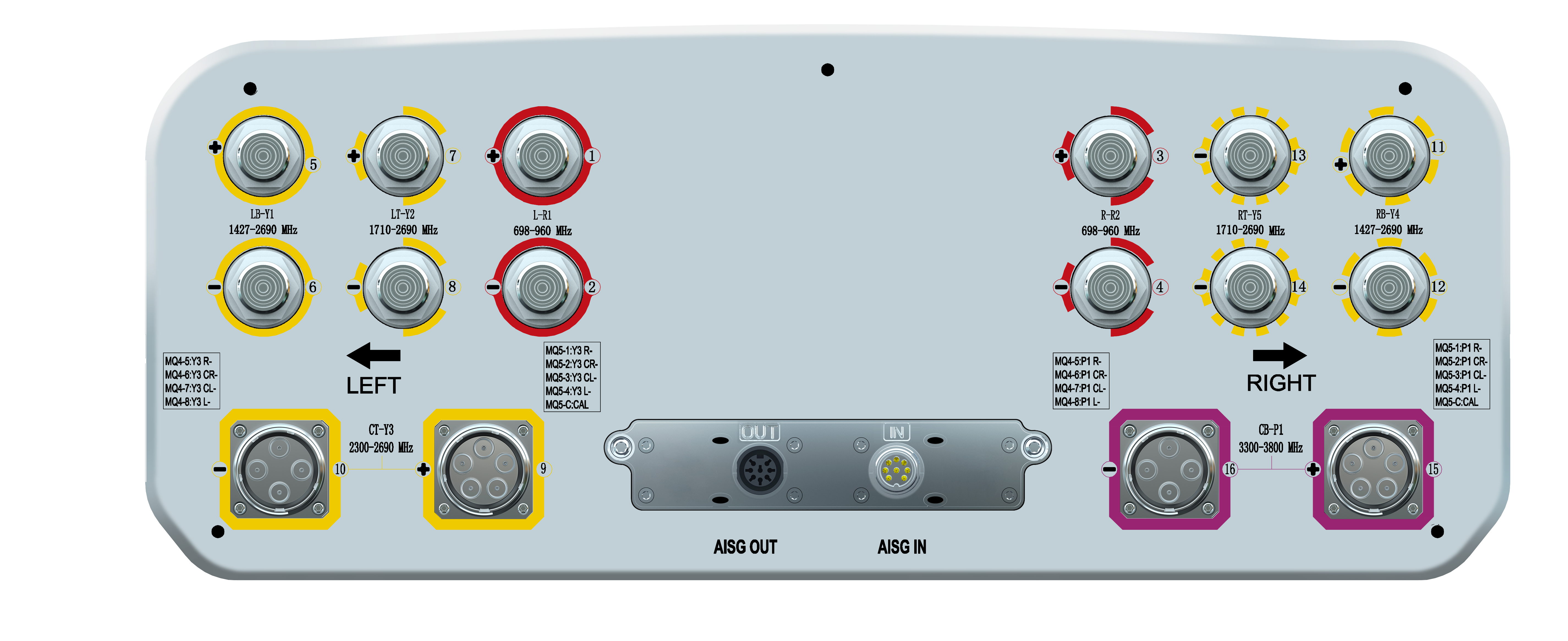16-Port Beamforming Antenna, 2×698-960MHz and 2×1427-2690MHz 65° HPBW, and 2490-3800MHz Beamforming 8T8R, 5×RET
