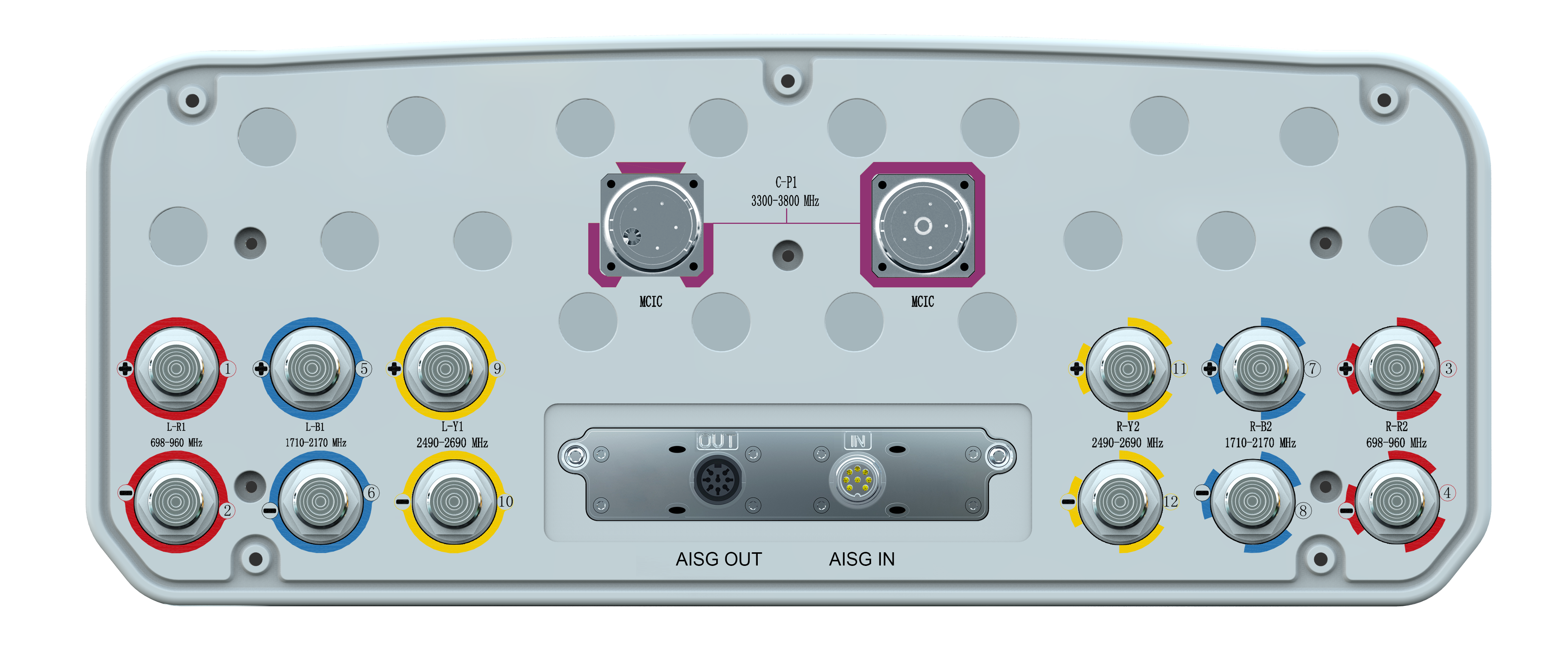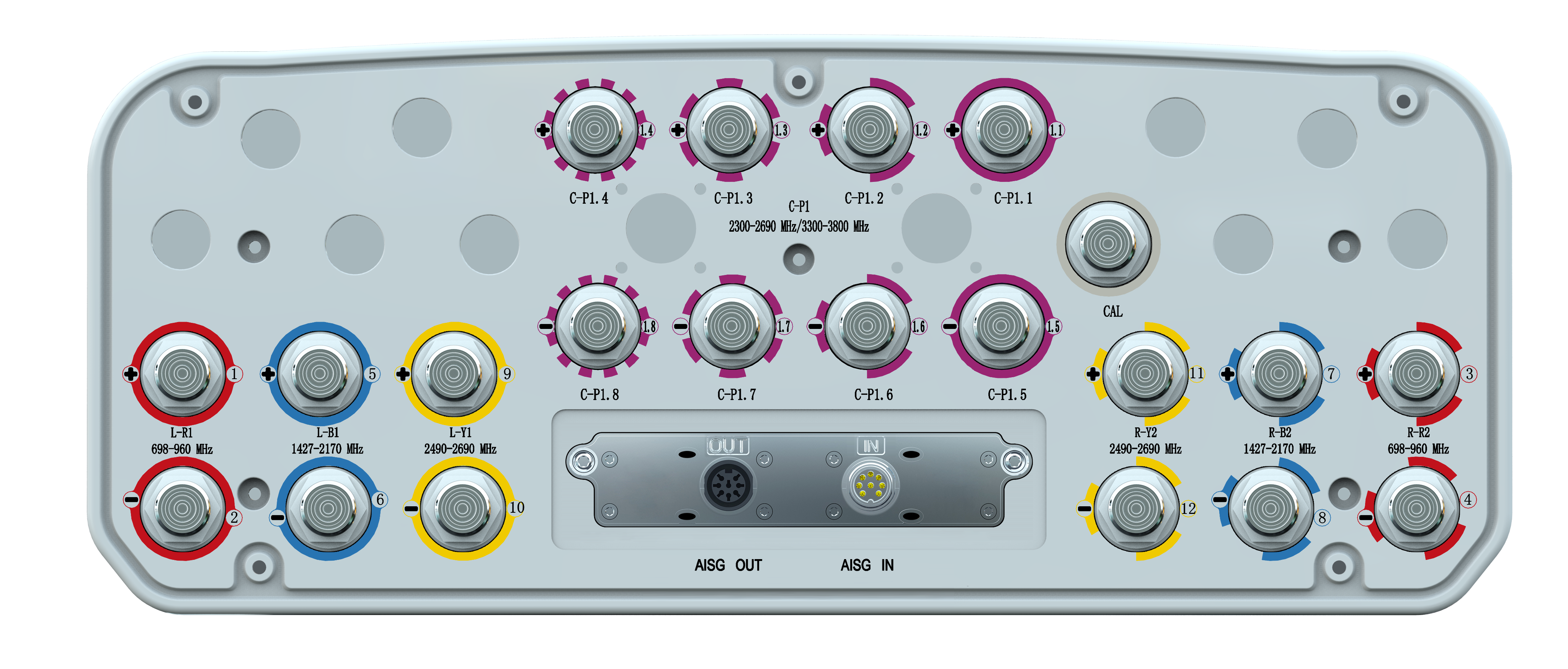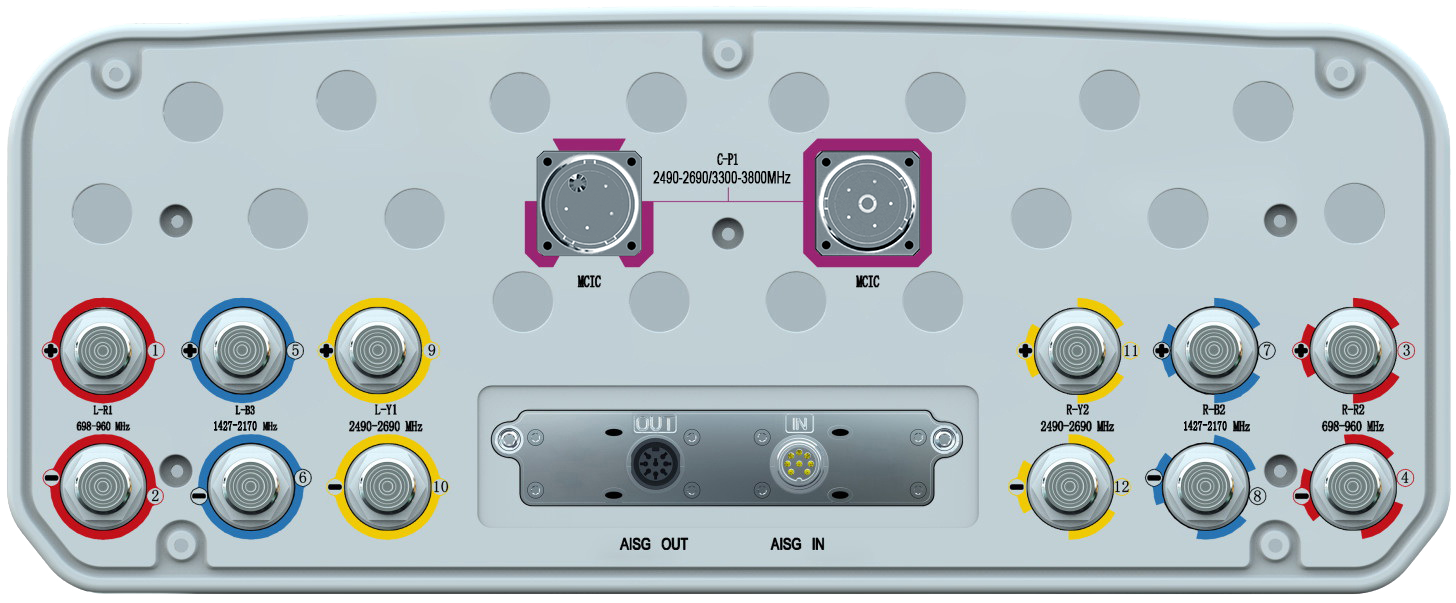 24-Port Beamforming Antenna, 2×698-960MHz and 4×1710-2690MHz and 2×1427-2690MHz 65° HPBW, and 2300-3800MHz Beamforming 8T8R, 9×RET