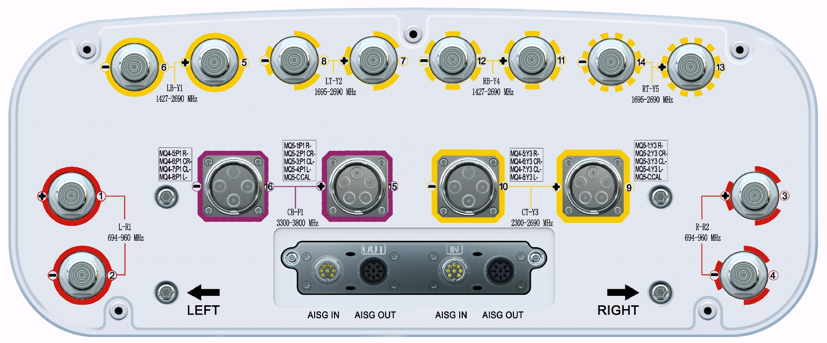 16-Port Beamforming Antenna, 698-862MHz and 880-960MHz and 1710-2170MHz and 2490-2690MHz 65° HPBW, and 2490-3800MHz Beamforming 8T8R, 5×RET